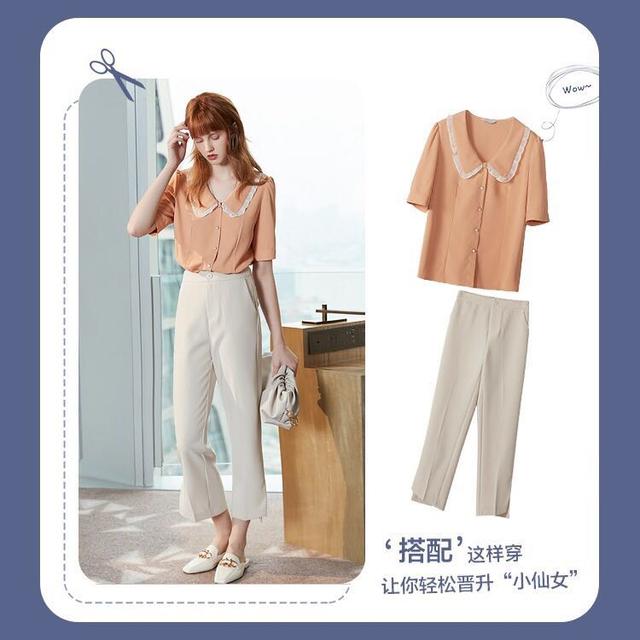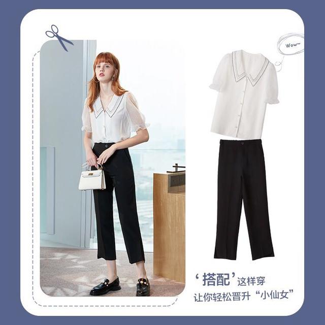 简单的黑白配色也能打造出仙气的感觉,白色的短袖上衣搭配黑色九分西服裤,这一身打扮看起来干净利落。