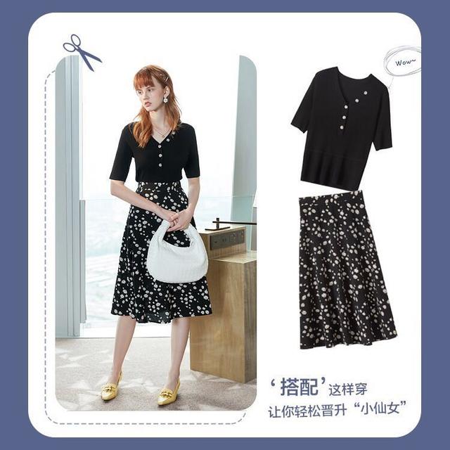 紧身的黑色针织上衣搭配长款白花黑底碎花裙,整个人的气质显得温婉又淑女,搭配上白色的手提包轻松晋升“小仙女”。针织上衣的领口装饰是独特的V领设计,用扣子做装饰增添的衣服的时尚度。