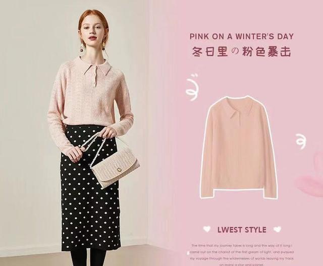 藕粉色是一个非常百搭的颜色,因为有的光线下面看起来其实和杏色非常类似,男装搭配,那么我们都知道,杏色是相当百搭的,基本上什么颜色都可以搭配,而这样的藕粉色作为内搭自然也非常经典。这款polo领的针织内搭,有一些麻花的纹路设计,搭配上波点的直筒毛呢裙,非常的百搭,适合职场的女人日常上班穿着,显得很有气质。