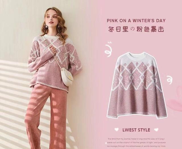 粉色毛衣的应用也是非常广泛的,与直筒裤相结合,粉色就能够透露出非常甜美的感觉。粉色的毛衣设计感主要体现在图案上面,给人一种在雪地里的感觉,增添了这款毛衣的厚度感,让人觉得穿起来非常仙女,比较温暖。搭配的裤子也是针织的直筒裤,颜色比上衣的粉色更加深一些,整套搭配有仙气更有淑女气息。