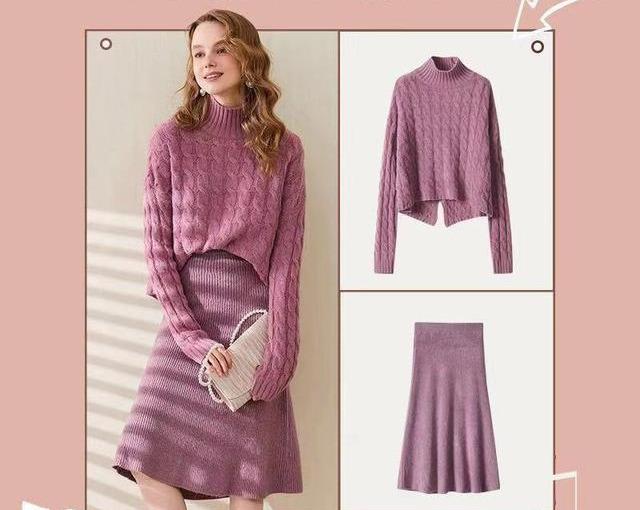 粉色和紫色相融合之后,成为了粉紫色,这样的颜色比紫色更耐看,又比粉色更加成熟。这一套的毛衣套装是应用了粉紫色的颜色,而且,上衣应用了麻花的设计,做成了短款的小高领款式,虽然不会特别宽松,但也不是特别的修身,合体的版型能更好修饰身材。下装穿A字针织裙,对于大腿的肉是有很好的遮肉作用,视觉上显瘦一些。