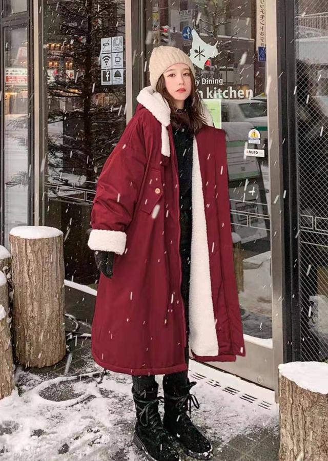 担心短款的棉服不保暖,没有关系,棉服也有长款的嘛。这件工装款式的长款棉服就非常适合温度比较低的地区的妹子来穿。衣服的长度非常长,几乎能够到脚踝的位置,穿上之后一定非常保暖。工装的款式也非常帅气,帽子和袖口采用白色羊羔绒的设计,温暖的感觉扑面而来,还增加了可爱的气质。棉服整体是酒红色,醒目又浓郁,对于不喜欢大红色的仙女,可以试试这件酒红色的长袍,让你醒目却不夸张,喜庆又有味道。