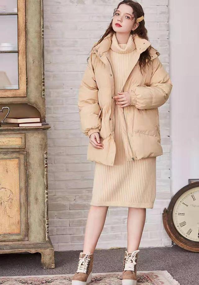 这件棉服在搭配的时候也非常百搭,我们可以直接搭配一件和棉服同色系的针织连衣裙。内搭的连衣裙同样是非常简单的设计,整体就是纯色的直筒版型,因为款式比较宽松,所以非常显瘦,宽松高领的设计也非常保暖而且显出气质的优雅。
