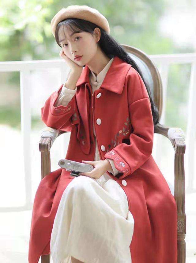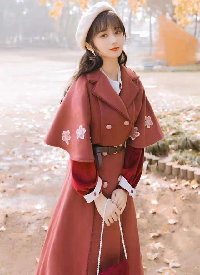 上图中的这件大衣虽然很好看,但是因为上半身是斗篷的设计,所以难免会有一些漏风,如果你是怕冷的小仙女,还可以看看这件大衣,同样是低调的砖红色,加上很多精致的绣花。最重要的是它在胸前的位置也设计了小斗篷的装饰,看起来更加简单雅致。