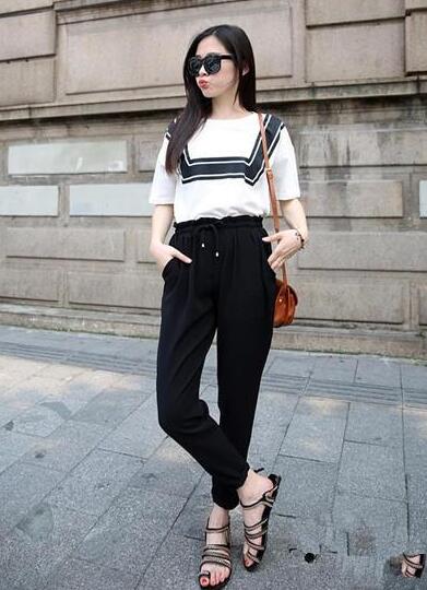 像那种简单的白色纯色t恤,是不会让女生的肤色显得更黑的,而且能够在一定程度上提亮女生的肤色。用白色t恤搭配一条黑色的休闲裤,整体服装搭配的色彩对比比较的鲜明,也是属于比较时尚的经典搭配了。